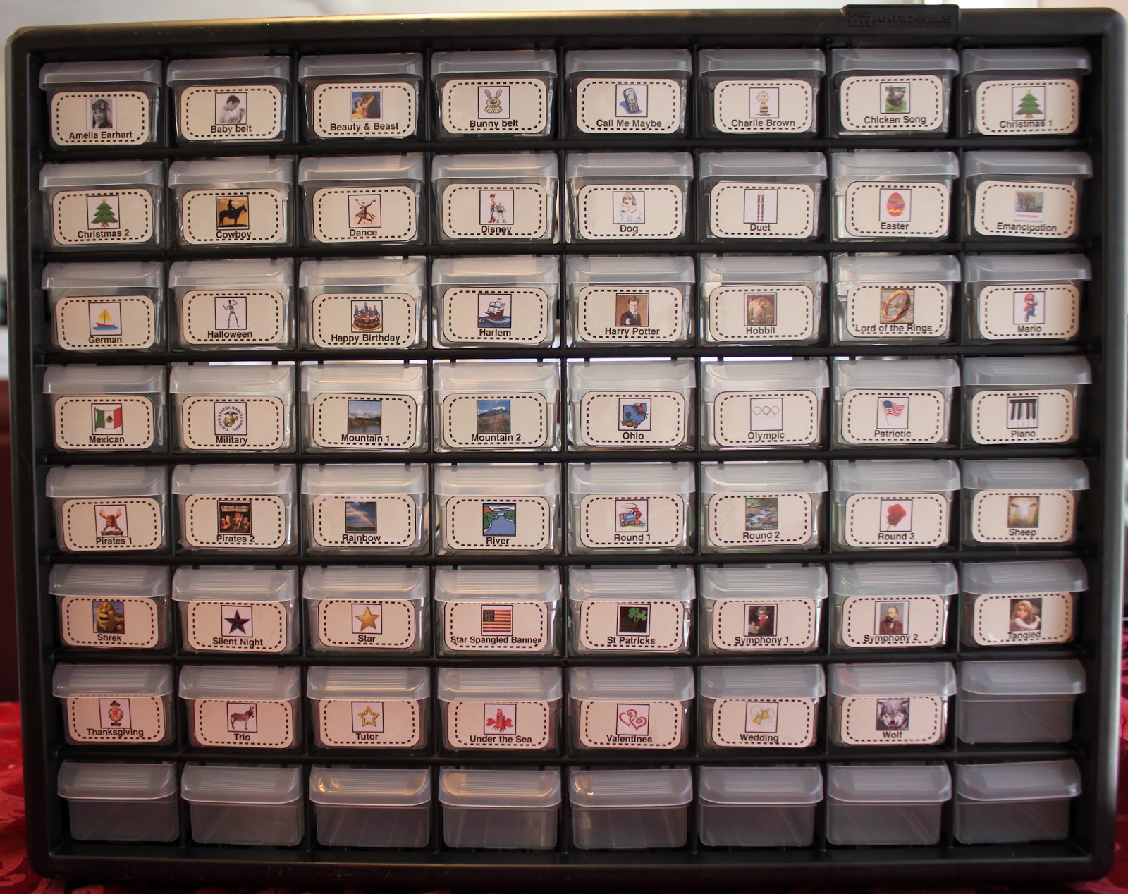 I took my icons that I use for the students to put on their Black belt recorder charts and made labels for the drawers. It is going to work well. I even have room for some of the new belts we will come up with!
